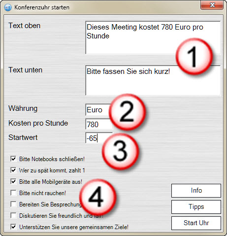 Eine Konferenzuhr sollte kurz beschreiben, was sie darstellt. Diese Texte sind in meineZIELE frei einstellbar (1). Außerdem braucht man einen Startwert (3), einen Wert pro Stunde und eine Währung (2). Dann startet man einfach die Uhr.