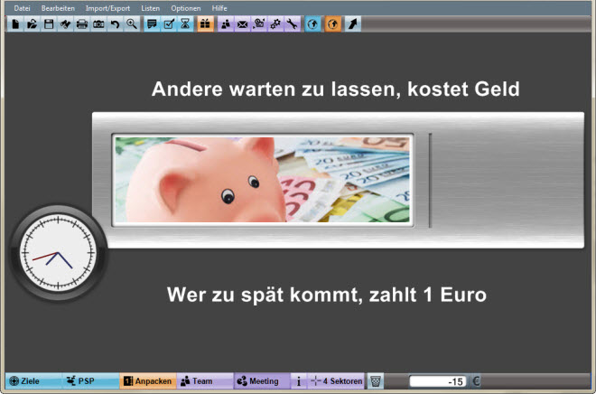 Sie möchten, dass Mobilfunkgeräte ausgeschaltet werden? Oder dass die Teilnehmer nicht ständig an etwas Anderem arbeiten? Immer öfter gilt deshalb die Regel: "Notebooks bleiben geschlossen". Pünktlichkeit verbessert man deutlich, indem man ein Sparschwein aufstellt und unpünktliche Personen einen Euro bezahlen lässt. Das muss unbedingt vorher angekündigt werden!!