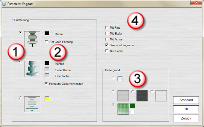 Im Parameterfenster wählen Sie die Grundform der Darstellung (1) und dazugehörige Farben (2), den Hintergrund (3) und eine Reihe von Zusatzeinstellungen (4):
