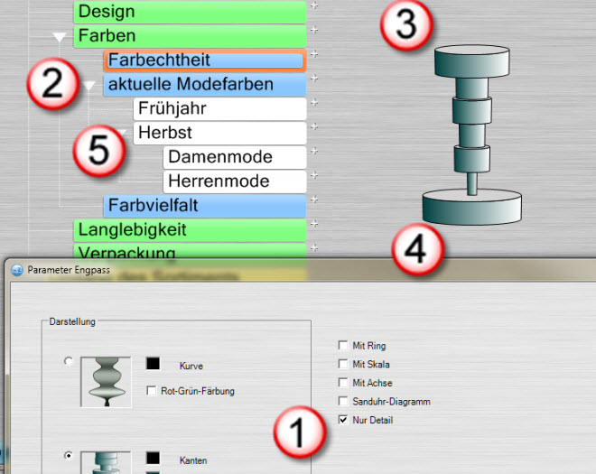 Die Auswahl "nur Detail" (1) begrenzt die Anzeige auf die Ebene des gerade gewählten Eintrags (2) und die diesem untergeordneten Einträge (5). Das Diagramm setzt sich also im Screenshot auf die grün dargestellte Ebene nach oben (3) und unten (4) nicht fort.