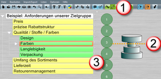 Jeder Teilnehmer nennt für die gerade gewählte Zeile (2) eine Punktezahl (je höher die Zahl, desto enger der Engpass, vergleichbar mit deutschen Schulnoten) Mit einem Klick auf die entsprechende Zahl (3) wird die Bewertung festgehalten und sofort in den Durchschnitt eingearbeitet und auch sofort graphisch umgesetzt. Wechselt man auf die nächste Zeile (z.B. Pfeiltaste nach unten), dann beginnt die Durchschnittsbildung für diese Zeile von vorne.