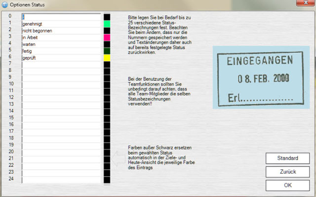 Empfehlung für das Feld Status: Verwenden Sie möglichst wenige verschiedene Stati. Z. B. könnte Ihre Statustabelle aussehen wie in der dargestellten Abbildung. Die Tabelle wird gepflegt in den Optionen. Bitte achten Sie darauf dass alle Teammitglieder die selben Stati verwenden. In der Regel dürfte es ausreichen, einen Strich (Status ist unbestimmt), "in Arbeit" und "fertig" zu benutzen.