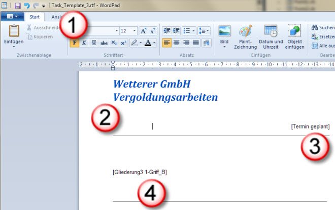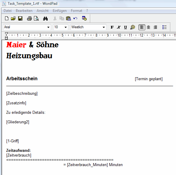 Es ist möglich, bis zu drei rtf-Dateien als Arbeitsschein-Templates anzulegen. Eines davon entsteht automatisch als Beispiel, das Sie nach Ihren Bedürfnissen umbauen können: Task_Template_1.rtf im Verzeichnis EigeneDateien\meineZIELE\Zusatzdokumente. Weitere Templates können Sie im selben Ordner mit den Nummern 2 bzw 3 anlegen. In diesen Templates können in eckigen Klammern Platzhalter für Informationen aus der aufgerufenen Aufgabe gesetzt werden. Beispielsweise wird dann [Zielbeschreibung] ersetzt durch den Aufgabentext.