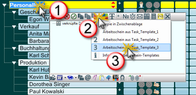 Jetzt speichert er das Template ab und startet gleich die Liste: Linker Mausklick auf die Zeile "Personalliste" (1), dann die Arbeitsschein-Liste öffnen (2) und dann das dritte Template (3).