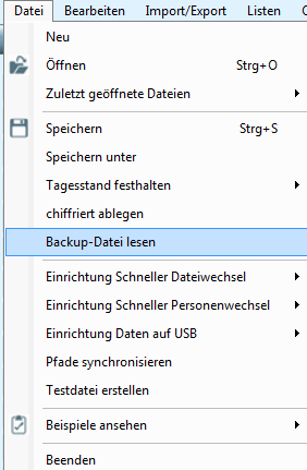 meineZIELE unterstützt Sie beim Zurückspeichern solcher Backup-Dateien, siehe Abbildung. Sie können Backupdateien mit dem Menüpunkt "Backup-Datei lesen" einfach auswählen. Dann erstellt meineZIELE eine Kopie davon und öffnet diese. Wenn Sie sich für die weitere Nutzung dieser Datei entscheiden, können Sie diese mit "Speichern unter" wieder unter dem gewünschten Namen ablegen.
