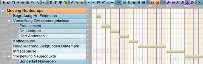 Die Zeitplan-Ansicht, kann, wie angedeutet, zur vereinfachten Erfassung von Terminen eingesetzt werden. Das Haupt-Einsatzgebiet liegt jedoch bei der Darstellung zusammenhängender Projekte, insbesondere mit mehrtägigen Planungsabschnitten wie unten dargestellt. Selbstverständlich kann der Zeitplan z.B. auch zur Darstellung einer Urlaubsplanung dienen.