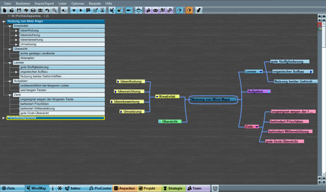 Verwenden Sie deshalb Mind Maps nur da, wo diese wirklich Vorteile bieten. Es ist in der Regel nicht sinnvoll, die Mindmap-Ansicht für das Entwickeln einer Gliederung zu verwenden. Es ist aber sehr sinnvoll, Aufgaben und Ziele, die man in der Ziele-Ansicht geplant hat, auch einmal in Form einer Mind Map anzusehen.