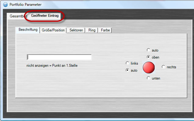 Einstellungen zu einzelnen Elementen können Sie im Bereich "Geöffneter Eintrag" vornehmen. Wählen Sie dazu zunächst das gewünschte Element per Mausklick aus. (In der Gliederung links wird der entsprechende Eintrag zur Bearbeitung geöffnet.) Öffnen Sie nun das Portfolio Parameter Fenster und wählen den Bereich "Geöffneter Eintrag" aus: