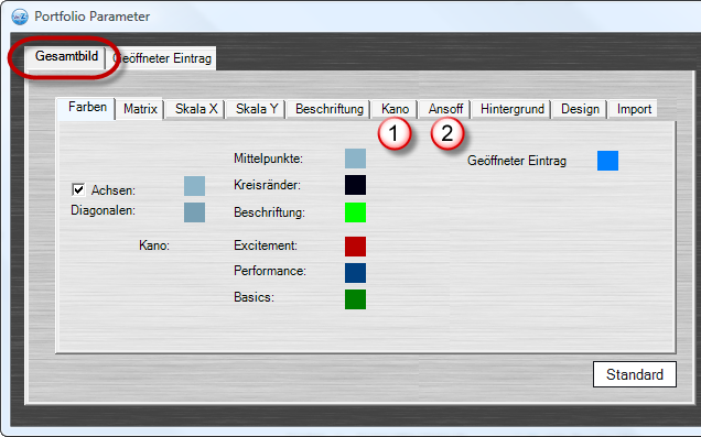 Das Parameterfenster erlaubt eine Vielzahl von Gestaltungsmöglichkeiten sowohl des Diagramms als auch der einzelnen Elemente. Hier werden auch Spezialdiagramme wie Kano-Diagramme (1) oder Ansoff-Diagramme (2) ausgewählt und in ihren Details eingerichtet:
